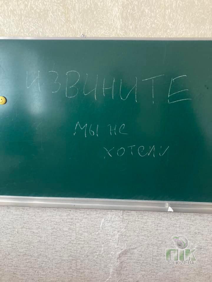 The inscription by the Russian military "Sorry, we didn't mean it" on the school blackboard. Basan, Zaporizhzhia region.