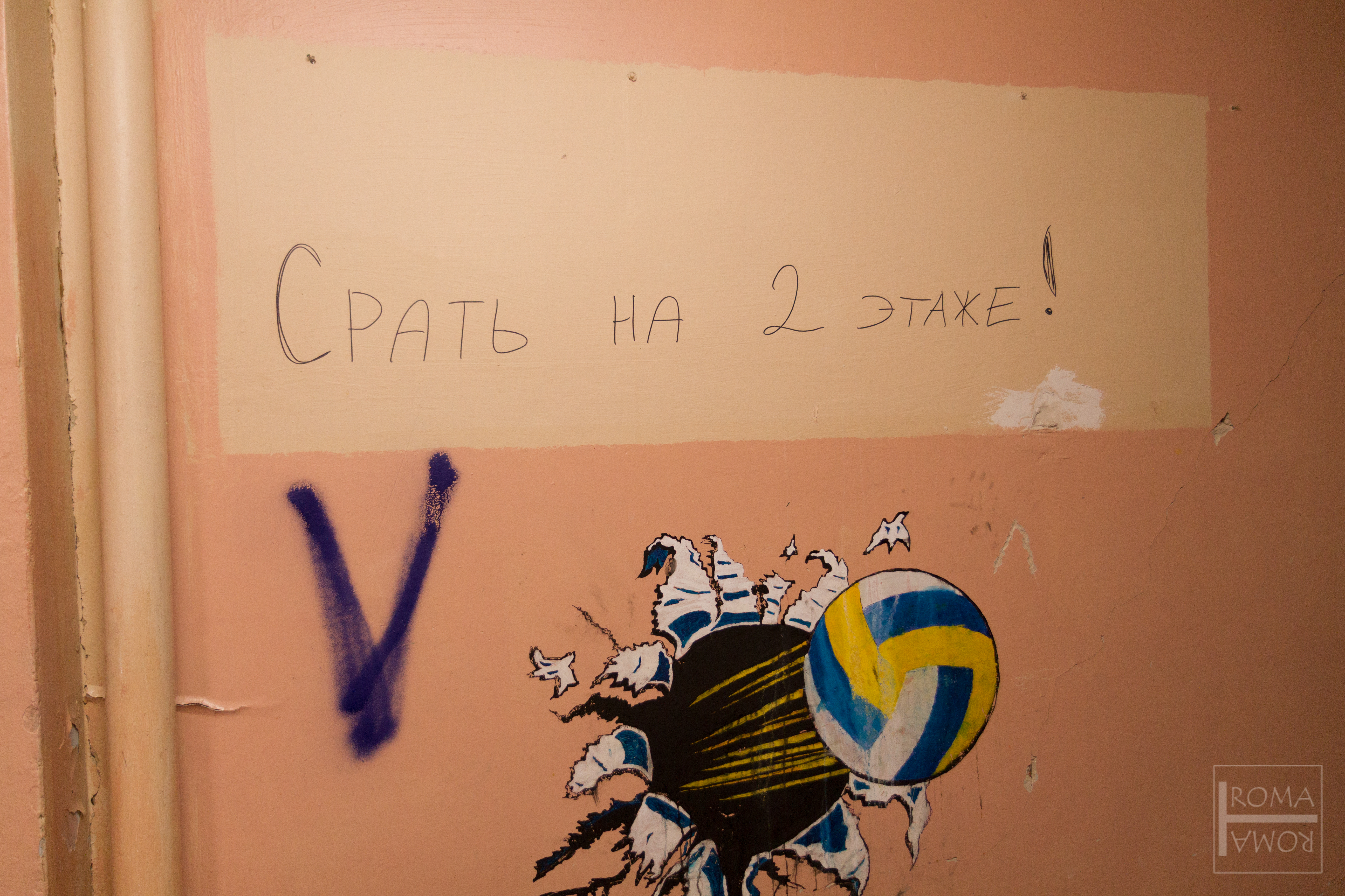 Inscriptions by Russian military "Take your shit on the 2nd floor!" and "V" on the wall of the school.