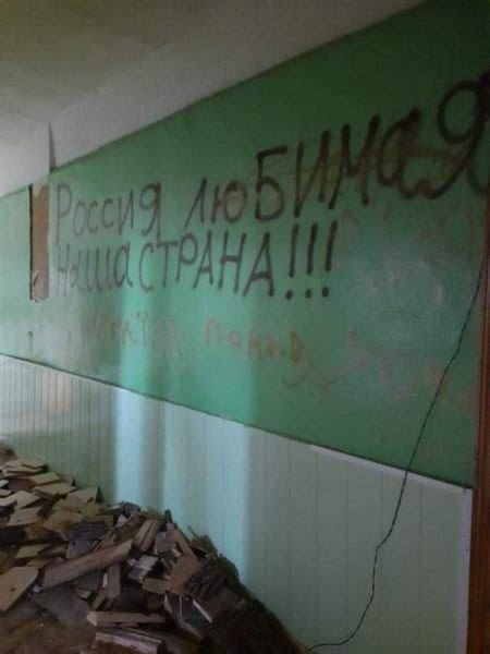 Inscription by Russian military "Russia is our favourite country!!!" on the school wall.